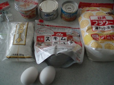 薄力粉・スキムミルク・コーンスターチ・卵・裏ごしカッテージチーズ・無糖練乳・フルーツらしい